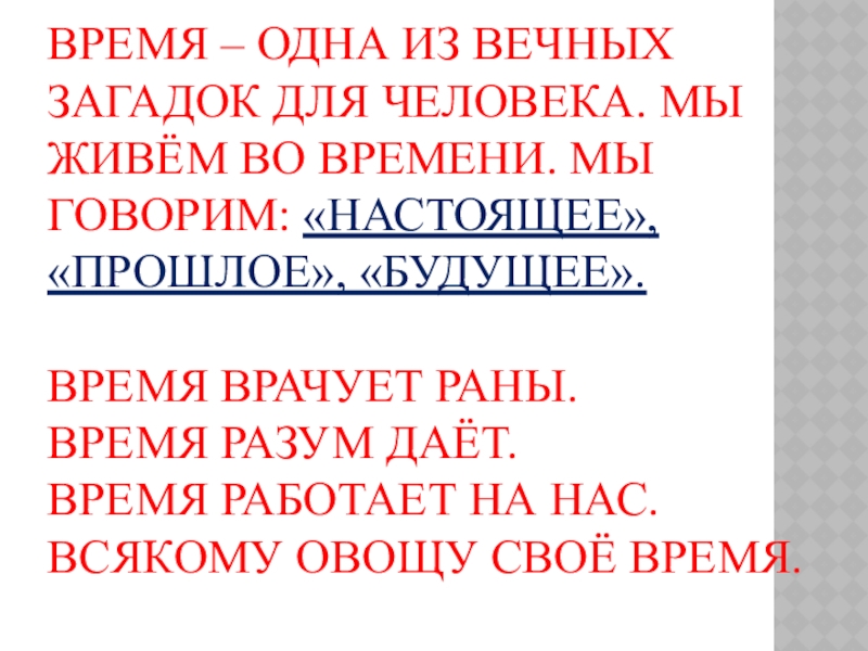 времени. Мы говорим: «настоящее», «прошлое», «будущее». Время врачует раны. Время разум даёт. Время работает на нас. Всякому овощу своё время.