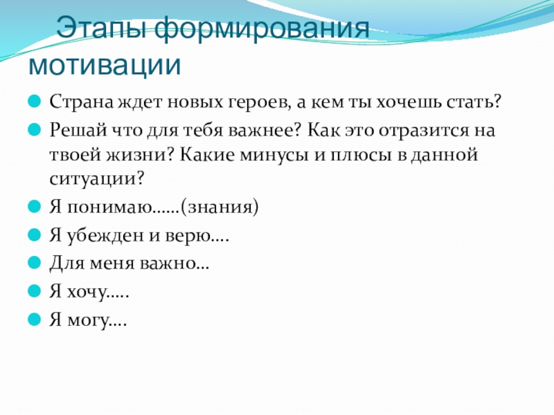 Этапы формирования мотивацииСтрана ждет новых героев, а кем ты хочешь стать?Решай что для тебя важнее?