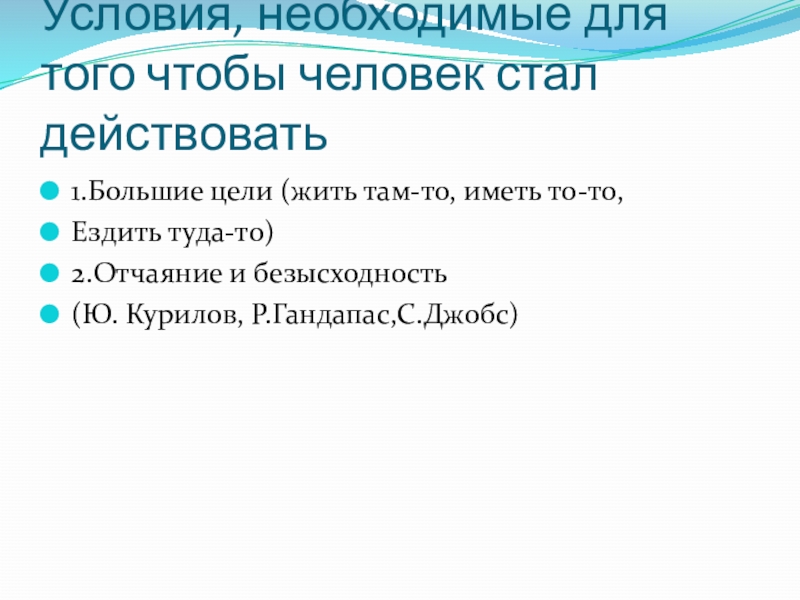 Условия, необходимые для того чтобы человек стал действовать1.Большие цели (жить там-то, иметь то-то, Ездить туда-то)2.Отчаяние и безысходность