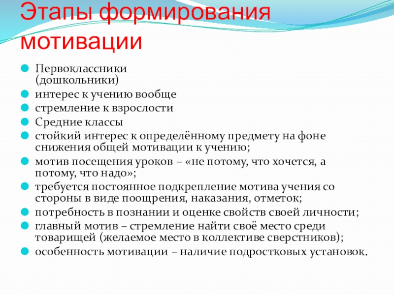 Этапы формирования мотивацииПервоклассники (дошкольники)интерес к учению вообщестремление к взрослостиСредние классыстойкий интерес к определённому предмету на фоне снижения