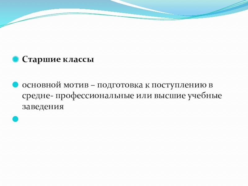 Старшие классыосновной мотив – подготовка к поступлению в средне- профессиональные или высшие учебные заведения