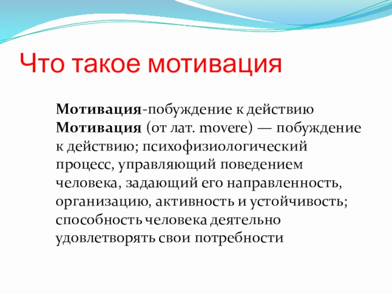 Что такое мотивацияМотивация-побуждение к действиюМотивация (от лат. movere) — побуждение к действию; психофизиологический процесс, управляющий поведением человека, задающий его направленность, организацию, активность и устойчивость; способность человека деятельно удовлетворять свои потребности