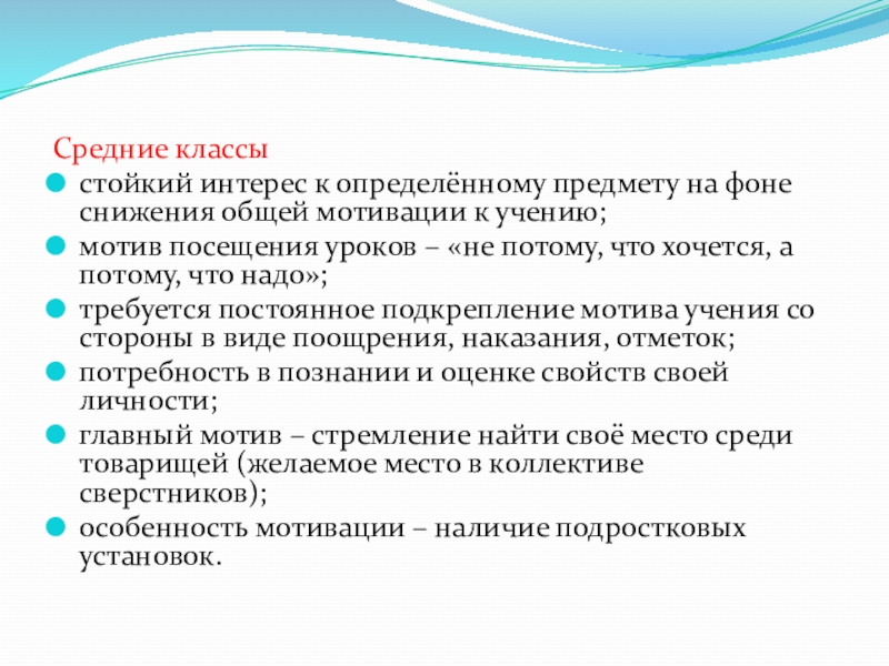 Средние классыстойкий интерес к определённому предмету на фоне снижения общей мотивации к учению;мотив посещения уроков – «не