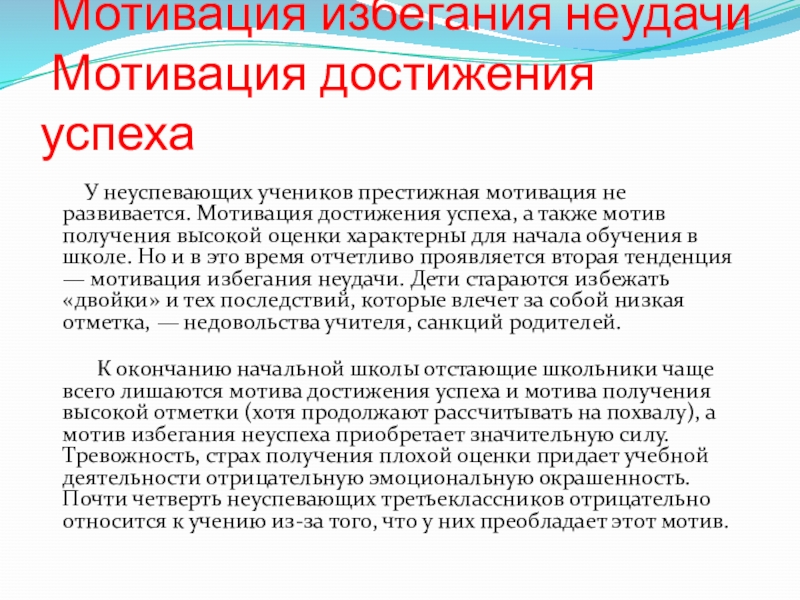 К окончанию начальной школы отстающие школьники чаще всего лишаются мотива достижения успеха и мотива получения высокой отметки (хотя продолжают рассчитывать на похвалу), а мотив избегания неуспеха приобретает значительную силу. Тревожность, страх получения плохой оценки придает учебной деятельности отрицательную эмоциональную окрашенность. Почти четверть неуспевающих третьеклассников отрицательно относится к учению из-за того, что у них преобладает этот мотив.