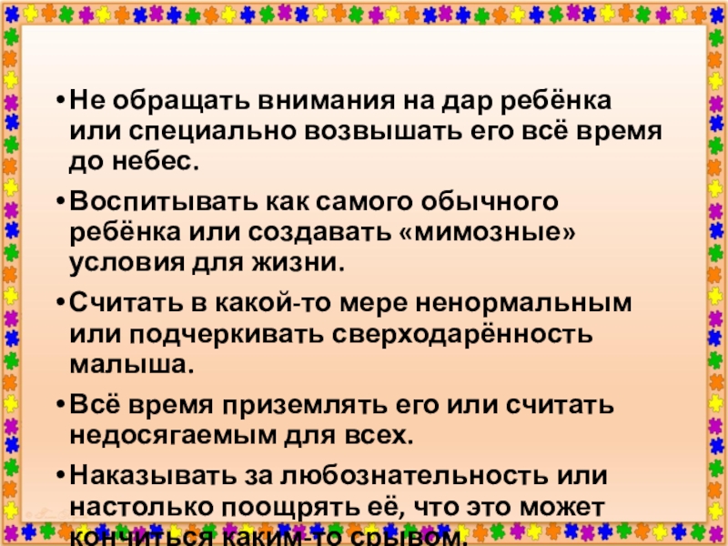 Слайд 14Не обращать внимания на дар ребёнка или специально возвышать его всё