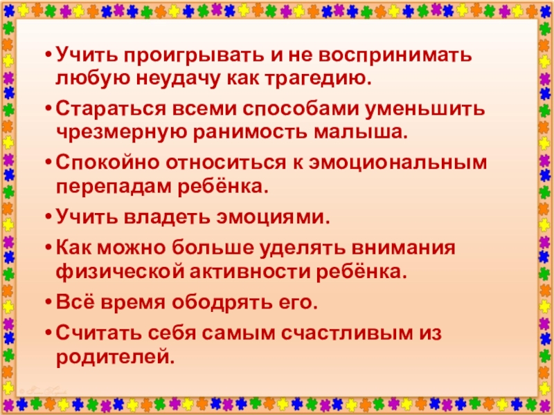 Слайд 12Учить проигрывать и не воспринимать любую неудачу как трагедию.