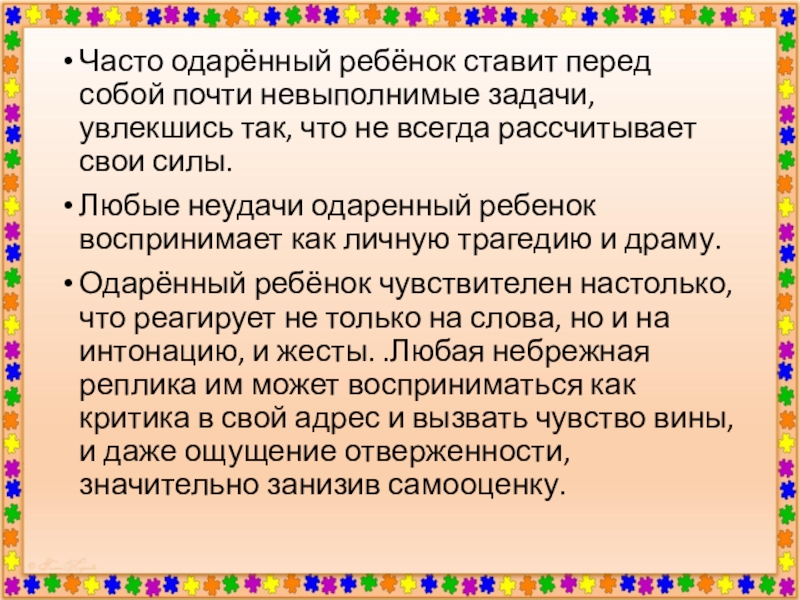 Слайд 6Часто одарённый ребёнок ставит перед собой почти невыполнимые задачи, увлекшись так,