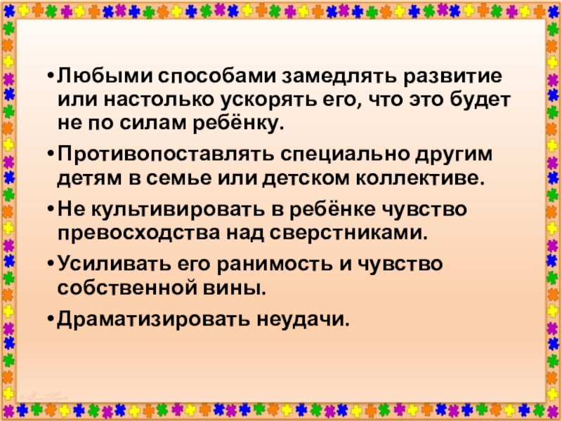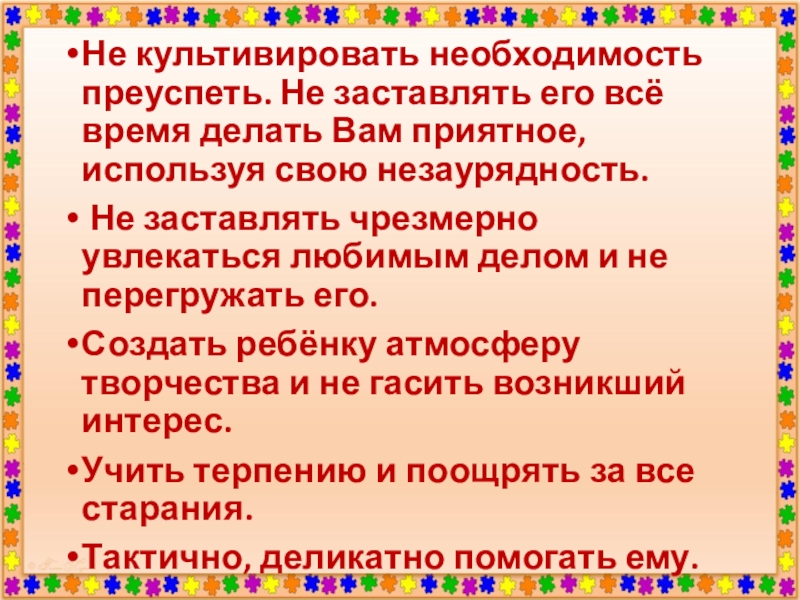 Слайд 11Не культивировать необходимость преуспеть. Не заставлять его всё время делать Вам