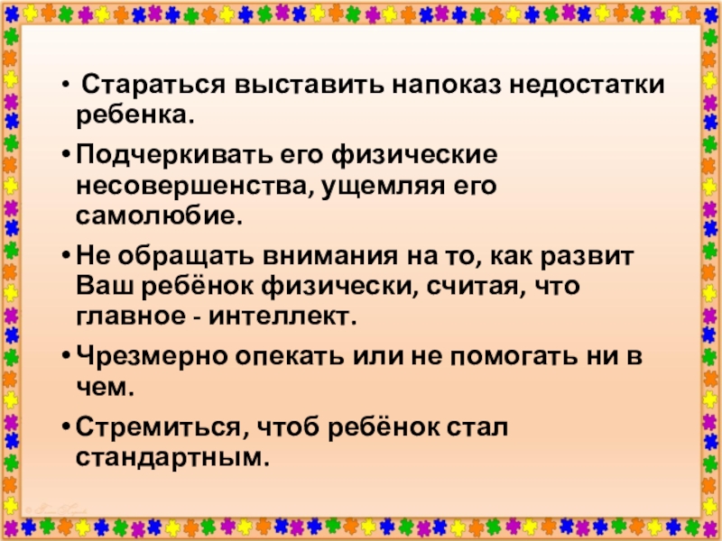 Слайд 16 Стараться выставить напоказ недостатки ребенка.