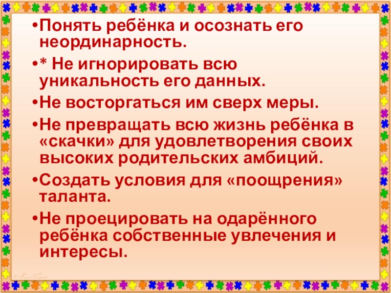 Слайд 10Понять ребёнка и осознать его неординарность.