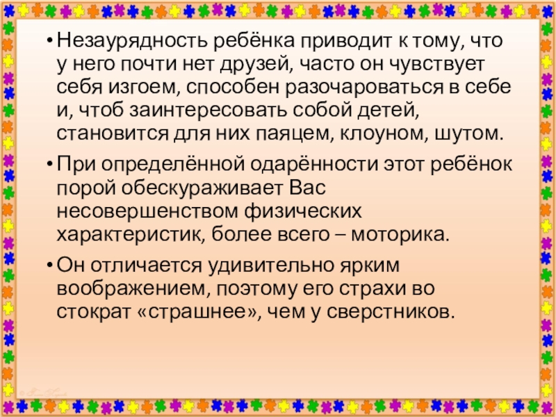 Слайд 8Незаурядность ребёнка приводит к тому, что у него почти нет друзей,