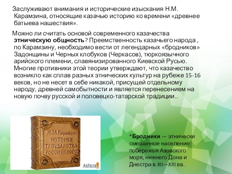 Слайд 5 Заслуживают внимания и исторические изыскания Н.М. Карамзина, относящие казачью