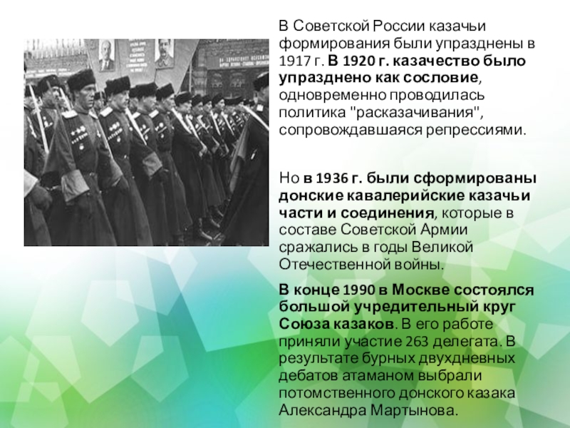 г. В 1920 г. казачество было упразднено как сословие, одновременно проводилась политика "расказачивания", сопровождавшаяся репрессиями.