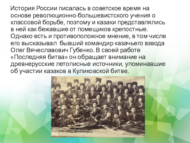 учения о классовой борьбе, поэтому и казаки представлялись в ней как бежавшие от помещиков крепостные. Однако есть и противоположное мнение, в том числе его высказывал бывший командир казачьего взвода Олег Вячеславович Губенко. В своей работе «Последняя битва» он обращает внимание на древнерусские летописные источники, упоминавшие об участии казаков в Куликовской битве.
