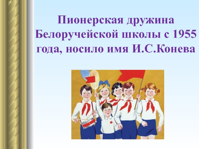 Слайд 25Пионерская дружина Белоручейской школы с 1955 года, носило имя И.С.Конева