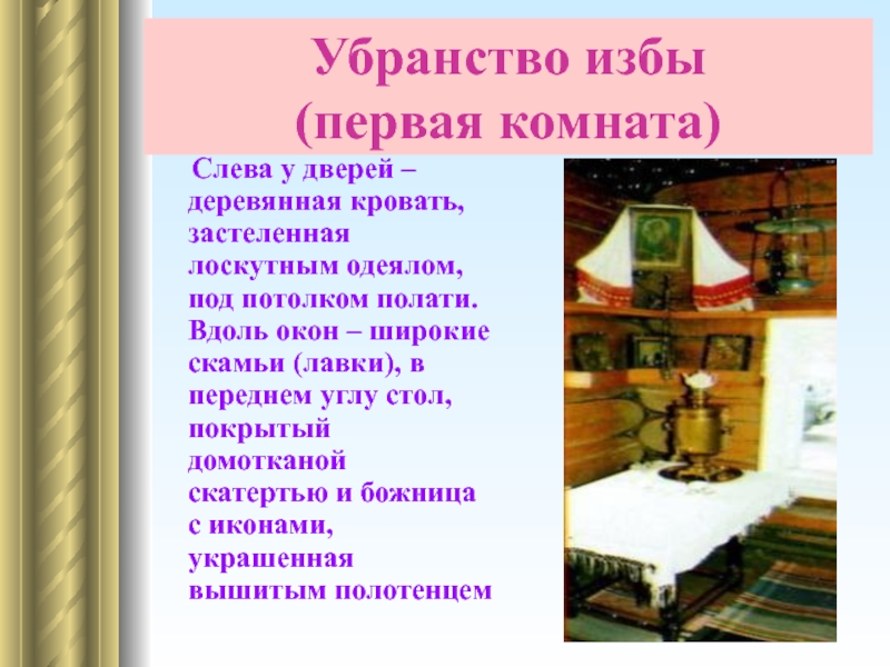 застеленная лоскутным одеялом, под потолком полати. Вдоль окон – широкие скамьи (лавки), в переднем углу стол, покрытый домотканой скатертью и божница с иконами, украшенная вышитым полотенцем