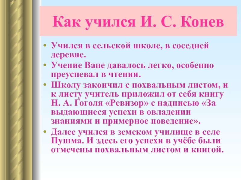 Школу закончил с похвальным листом, и к листу учитель приложил от себя книгу Н. А. Гоголя «Ревизор» с надписью «За выдающиеся успехи в овладении знаниями и примерное поведение».