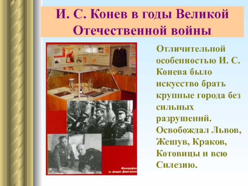 И. С. Конева было искусство брать крупные города без сильных разрушений. Освобождал Львов, Жешув, Краков, Котовицы и всю Силезию.