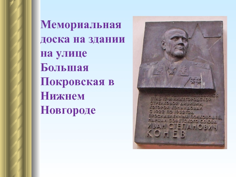 Слайд 20Мемориальная доска на здании на улице Большая Покровская в Нижнем Новгороде