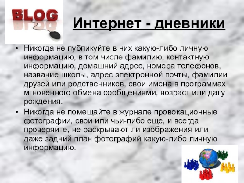 Никогда не помещайте в журнале провокационные фотографии, свои или чьи-либо еще, и всегда проверяйте, не раскрывают ли изображения или даже задний план фотографий какую-либо личную информацию.