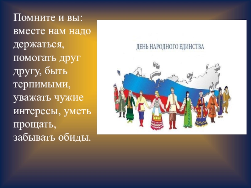 Помните и вы: вместе нам надо держаться, помогать друг другу, быть терпимыми, уважать чужие интересы, уметь прощать,
