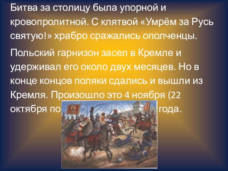Битва за столицу была упорной и кровопролитной. С клятвой «Умрём за Русь святую!» храбро сражались ополченцы.Польский гарнизон
