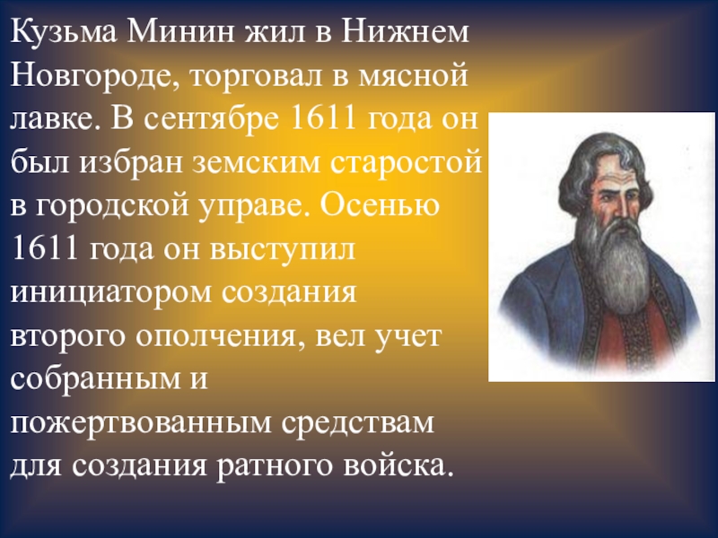 Кузьма Минин жил в Нижнем Новгороде, торговал в мясной лавке. В сентябре 1611 года он был избран