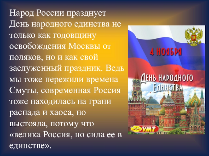 Москвы от поляков, но и как свой заслуженный праздник. Ведь мы тоже пережили времена Смуты, современная Россия тоже находилась на грани распада и хаоса, но выстояла, потому что «велика Россия, но сила ее в единстве».