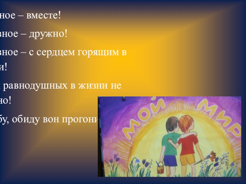 Главное – вместе! Главное – дружно! Главное – с сердцем горящим в груди! Нам равнодушных в жизни