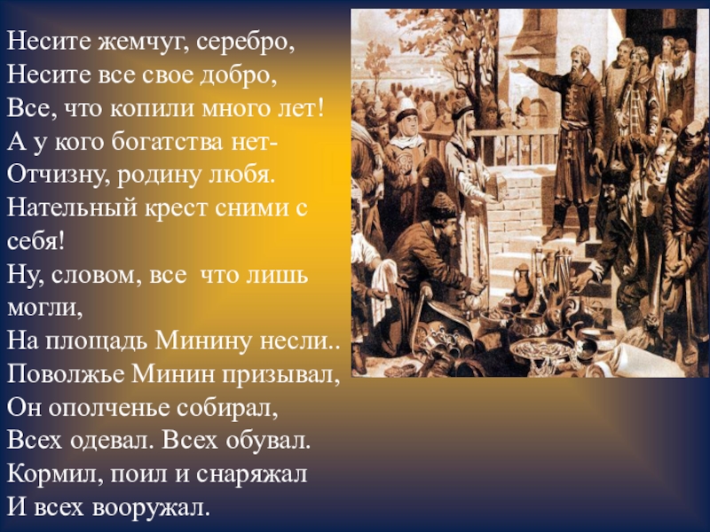 кого богатства нет- Отчизну, родину любя. Нательный крест сними с себя! Ну, словом, все что лишь могли, На площадь Минину несли.. Поволжье Минин призывал, Он ополченье собирал, Всех одевал. Всех обувал. Кормил, поил и снаряжал И всех вооружал.