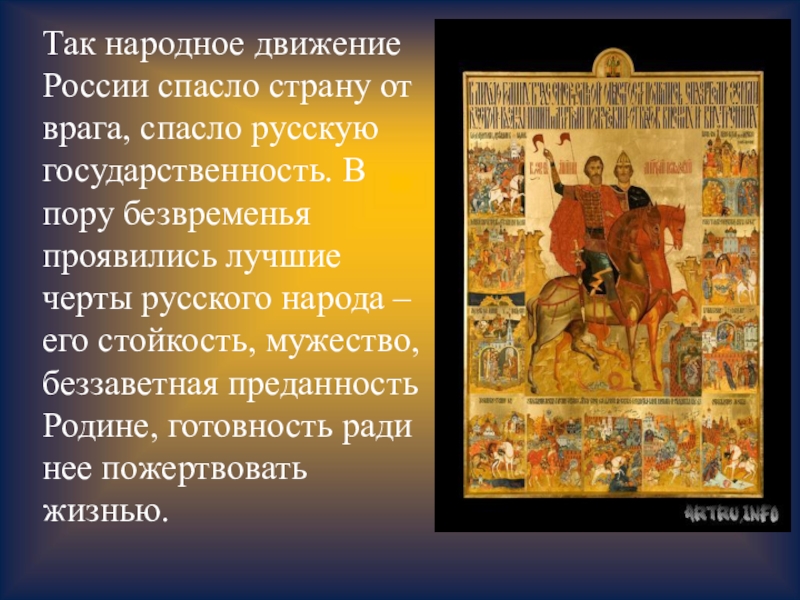 Так народное движение России спасло страну от врага, спасло русскую государственность. В пору безвременья проявились лучшие черты