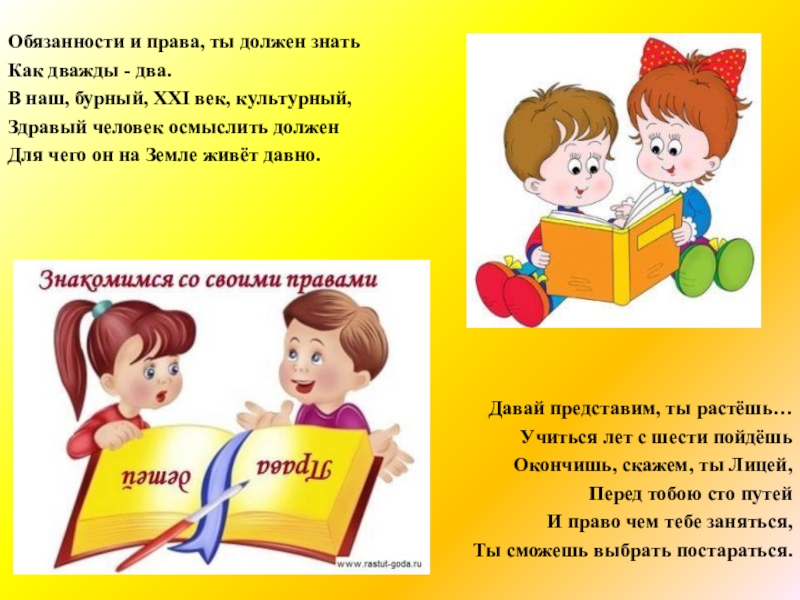 Обязанности и права, ты должен знатьКак дважды - два.В наш, бурный, XXI век, культурный,Здравый человек осмыслить долженДля чего он на Земле живёт давно.