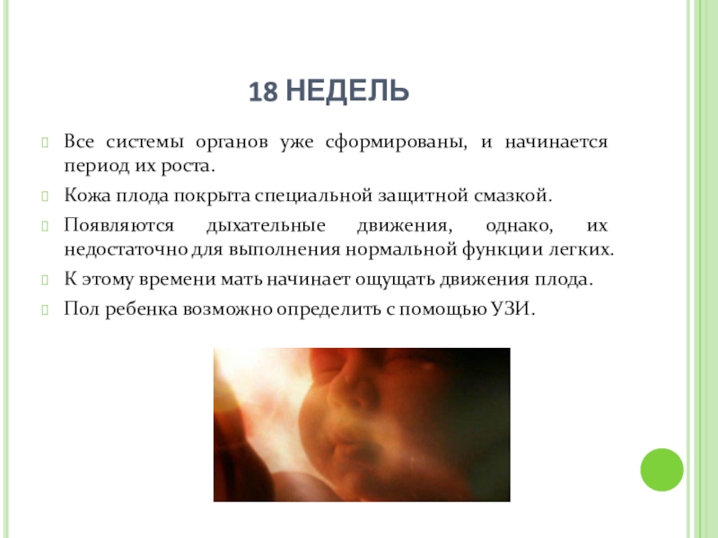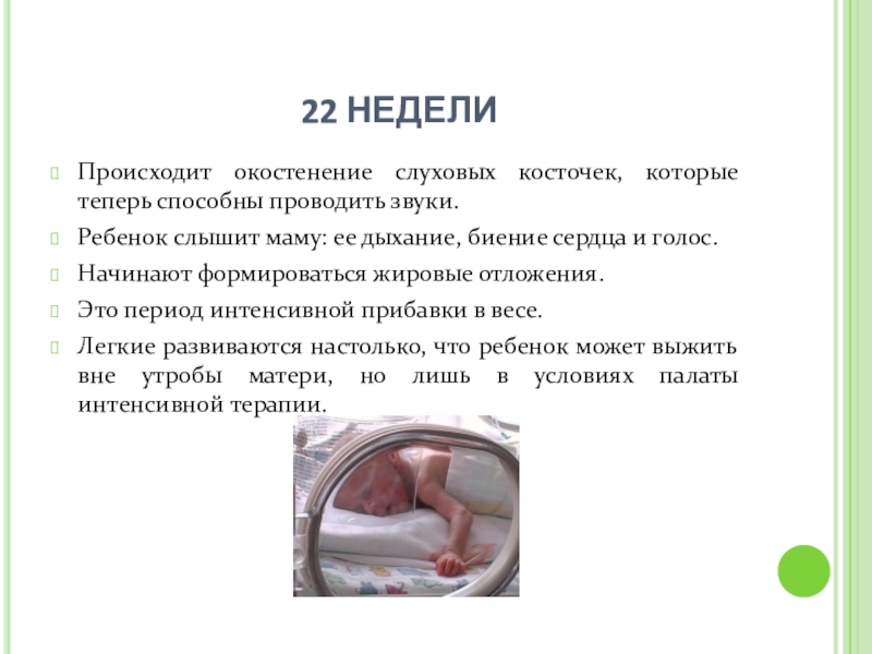 Легкие развиваются настолько, что ребенок может выжить вне утробы матери, но лишь в условиях палаты интенсивной терапии.