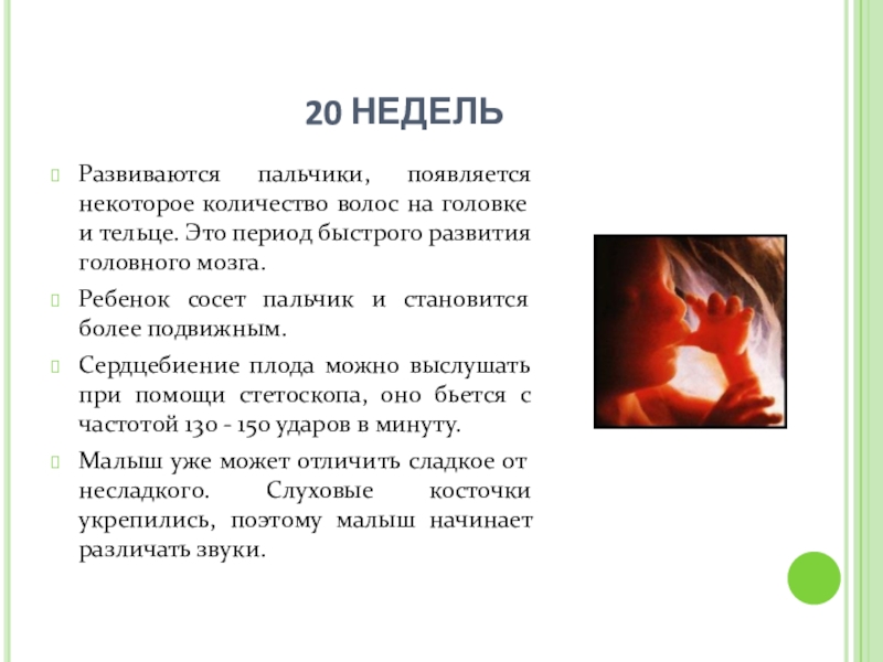Сердцебиение плода можно выслушать при помощи стетоскопа, оно бьется с частотой 130 - 150 ударов в минуту.