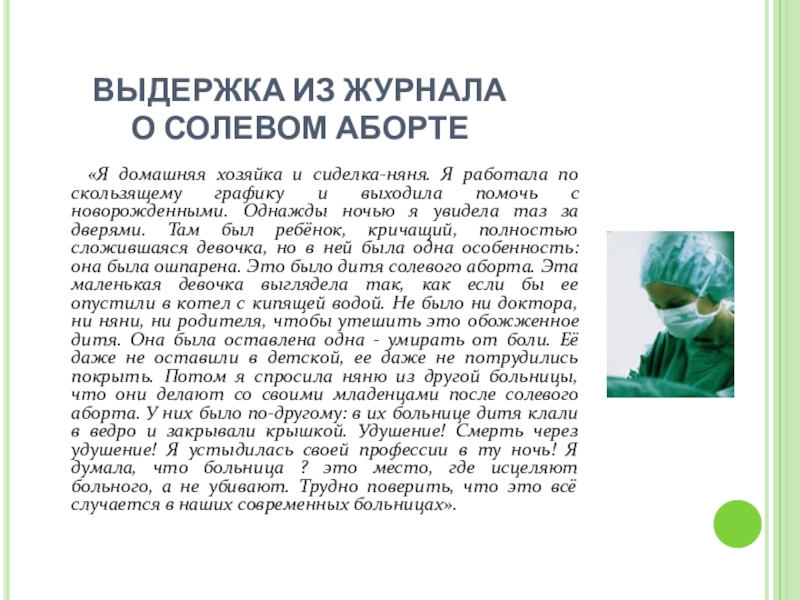 работала по скользящему графику и выходила помочь с новорожденными. Однажды ночью я увидела таз за дверями. Там был ребёнок, кричащий, полностью сложившаяся девочка, но в ней была одна особенность: она была ошпарена. Это было дитя солевого аборта. Эта маленькая девочка выглядела так, как если бы ее опустили в котел с кипящей водой. Не было ни доктора, ни няни, ни родителя, чтобы утешить это обожженное дитя. Она была оставлена одна - умирать от боли. Её даже не оставили в детской, ее даже не потрудились покрыть. Потом я спросила няню из другой больницы, что они делают со своими младенцами после солевого аборта. У них было по-другому: в их больнице дитя клали в ведро и закрывали крышкой. Удушение! Смерть через удушение! Я устыдилась своей профессии в ту ночь! Я думала, что больница ? это место, где исцеляют больного, а не убивают. Трудно поверить, что это всё случается в наших современных больницах».