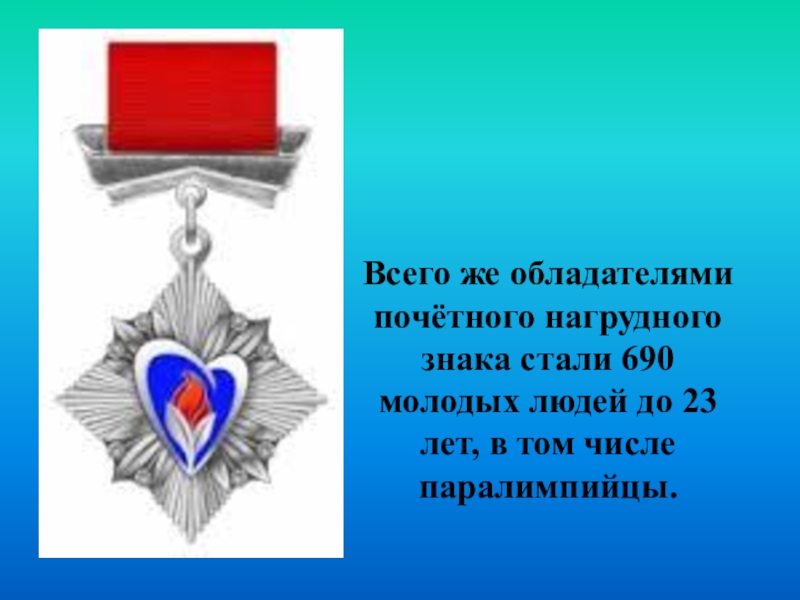 Слайд 6Всего же обладателями почётного нагрудного знака стали 690 молодых людей до