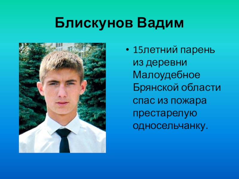 Блискунов Вадим15летний парень из деревни Малоудебное Брянской области спас из пожара престарелую односельчанку.