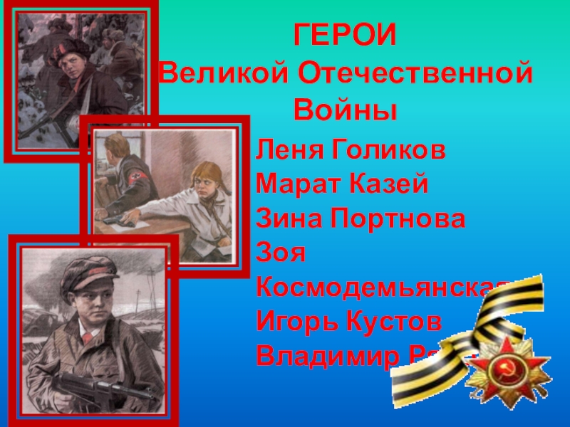 ГЕРОИ  Великой Отечественной ВойныЛеня ГоликовМарат КазейЗина ПортноваЗоя КосмодемьянскаяИгорь КустовВладимир Рябок