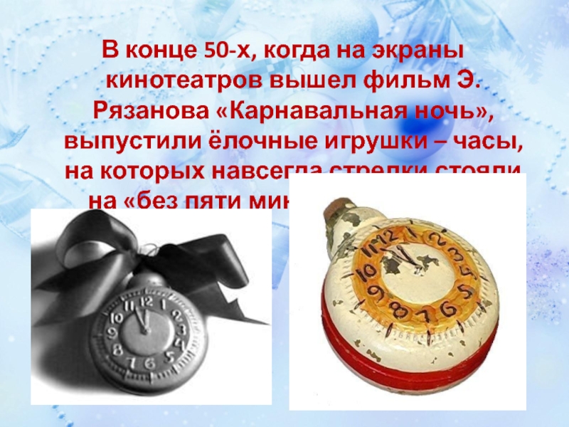 «Карнавальная ночь», выпустили ёлочные игрушки – часы, на которых навсегда стрелки стояли на «без пяти минут двенадцать».