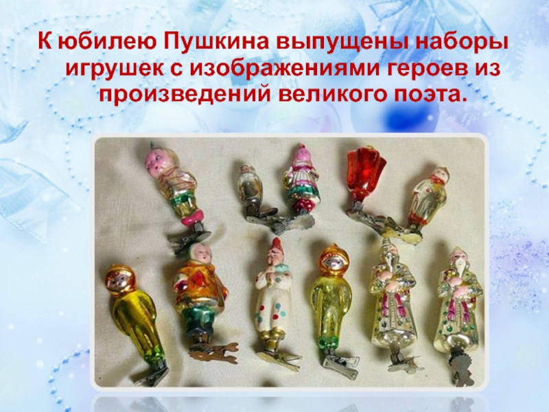 Слайд 30К юбилею Пушкина выпущены наборы игрушек с изображениями героев из произведений