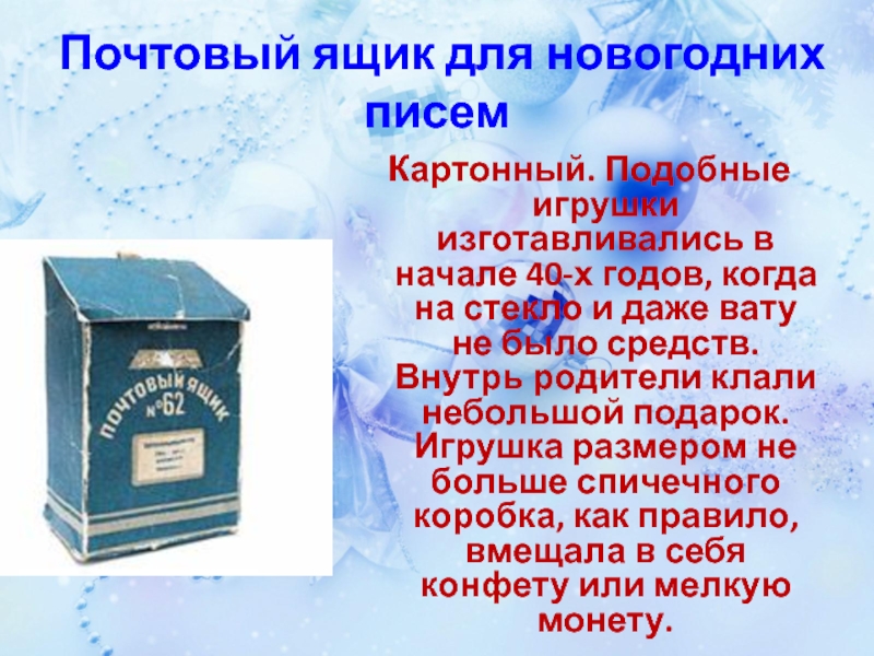 годов, когда на стекло и даже вату не было средств. Внутрь родители клали небольшой подарок. Игрушка размером не больше спичечного коробка, как правило, вмещала в себя конфету или мелкую монету.