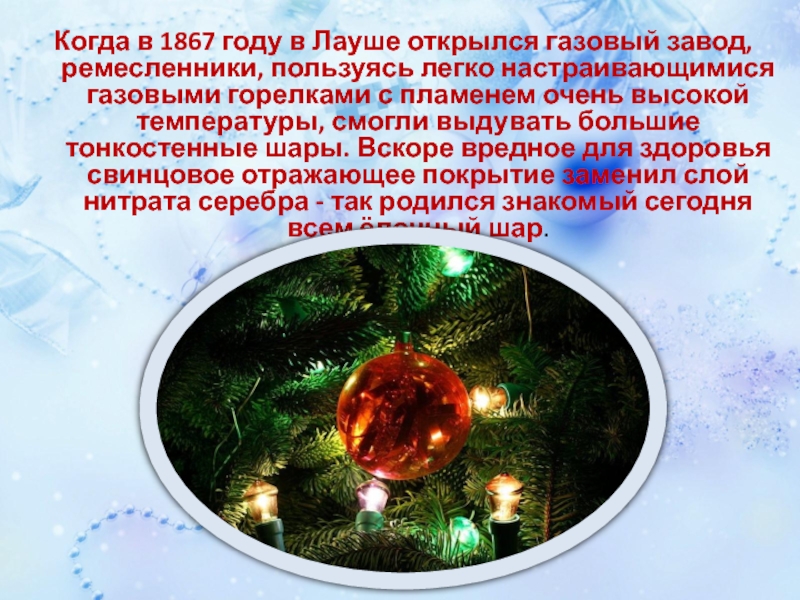 легко настраивающимися газовыми горелками с пламенем очень высокой температуры, смогли выдувать большие тонкостенные шары. Вскоре вредное для здоровья свинцовое отражающее покрытие заменил слой нитрата серебра - так родился знакомый сегодня всем ёлочный шар.