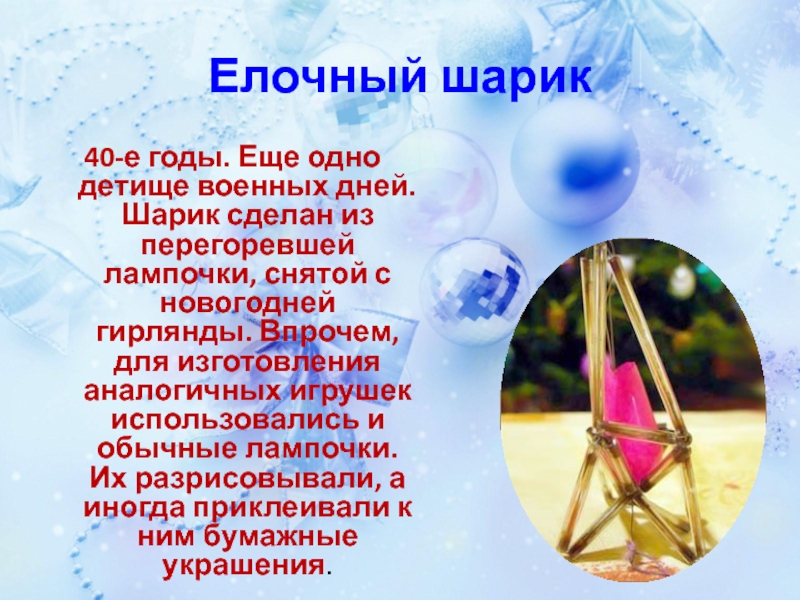 перегоревшей лампочки, снятой с новогодней гирлянды. Впрочем, для изготовления аналогичных игрушек использовались и обычные лампочки. Их разрисовывали, а иногда приклеивали к ним бумажные украшения.