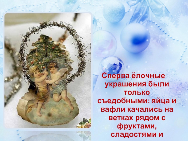 Слайд 4Сперва ёлочные украшения были только съедобными: яйца и вафли качались на