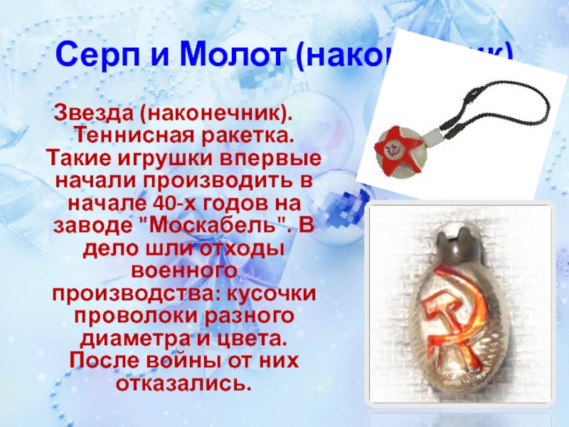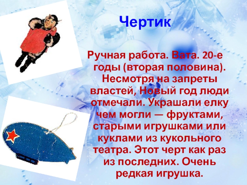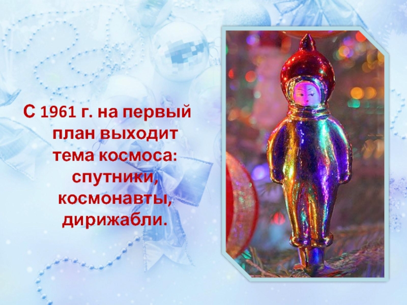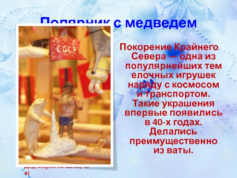 игрушек наряду с космосом и транспортом. Такие украшения впервые появились в 40-х годах. Делались преимущественно из ваты.