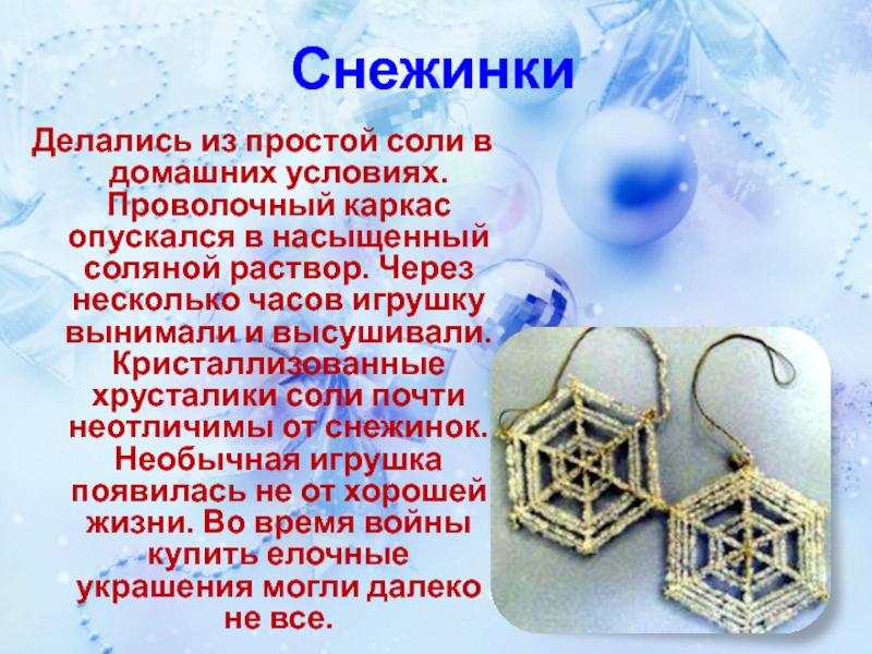 насыщенный соляной раствор. Через несколько часов игрушку вынимали и высушивали. Кристаллизованные хрусталики соли почти неотличимы от снежинок. Необычная игрушка появилась не от хорошей жизни. Во время войны купить елочные украшения могли далеко не все.