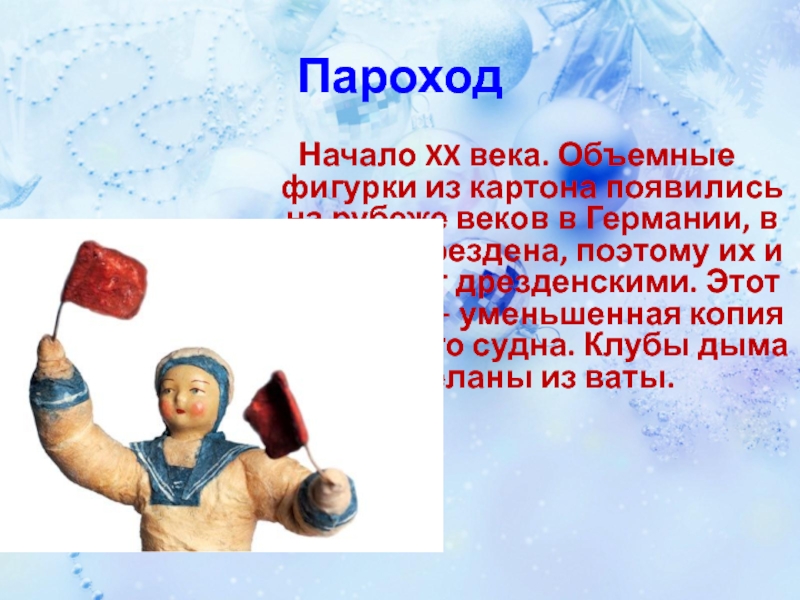в Германии, в районе Дрездена, поэтому их и называют дрезденскими. Этот пароход — уменьшенная копия настоящего судна. Клубы дыма сделаны из ваты.