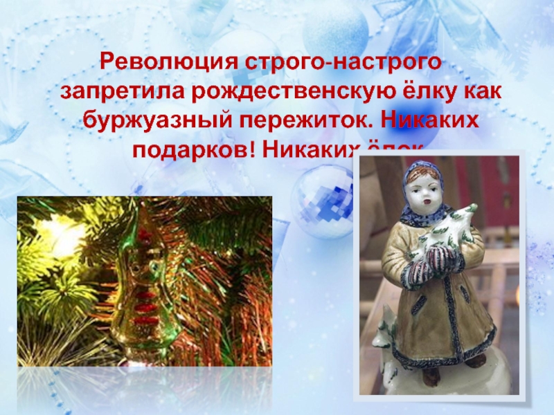 Слайд 11Революция строго-настрого запретила рождественскую ёлку как буржуазный пережиток. Никаких подарков! Никаких