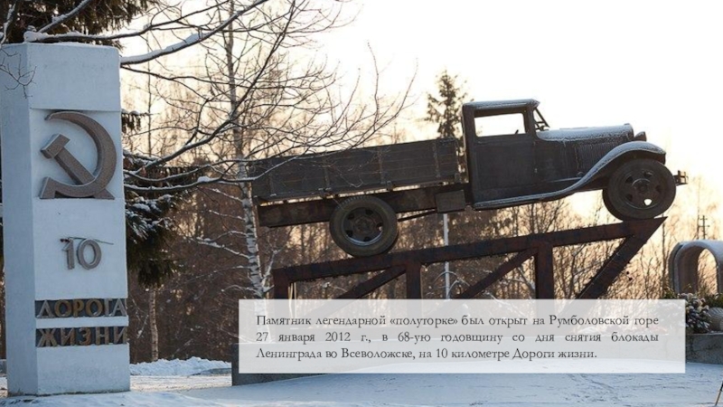 Слайд 30Памятник легендарной «полуторке» был открыт на Румболовской горе 27 января 2012