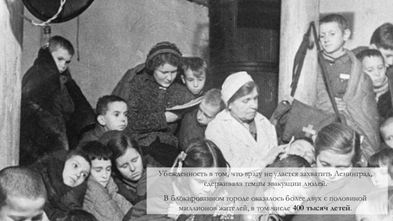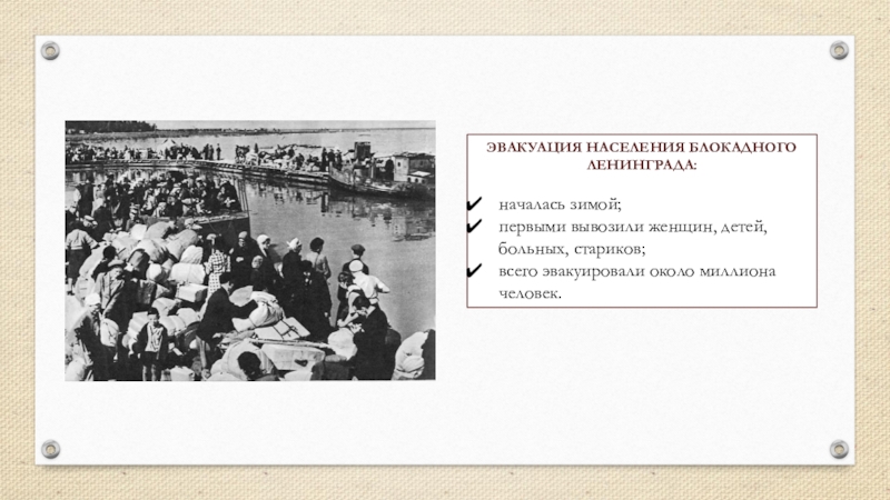 Слайд 27ЭВАКУАЦИЯ НАСЕЛЕНИЯ БЛОКАДНОГО ЛЕНИНГРАДА: